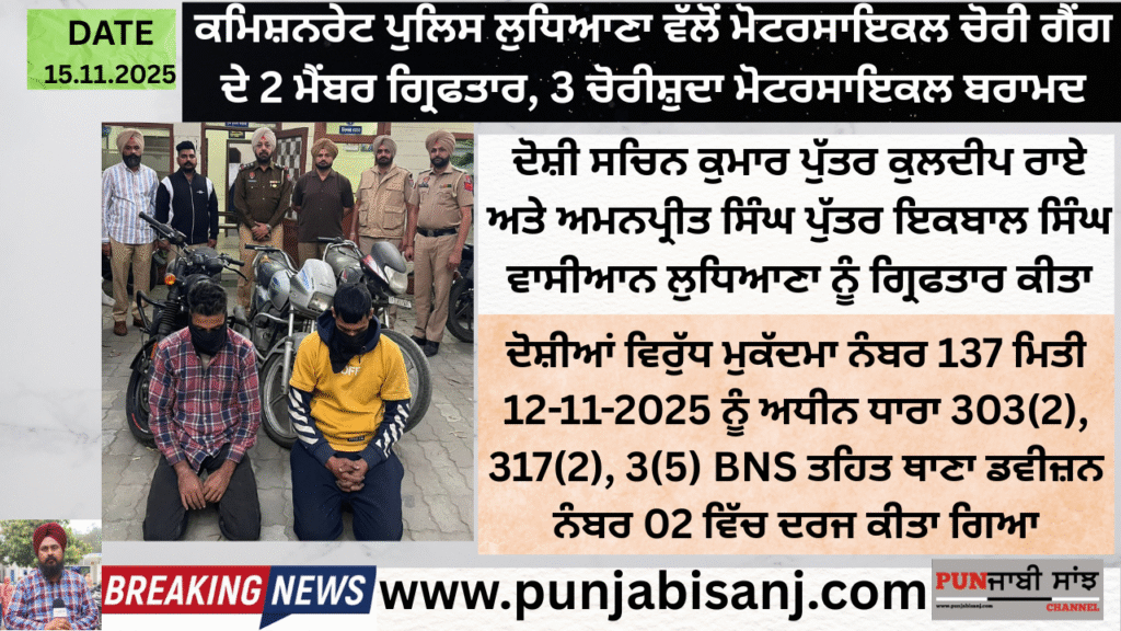 ਲੁਧਿਆਣਾ (15 ਨਵੰਬਰ 2025) ਥਾਣਾ ਡਵੀਜ਼ਨ ਨੰਬਰ 02, ਦੀ ਪੁਲਿਸ ਟੀਮ ਵੱਲੋਂ ਮੋਟਰਸਾਇਕਲ ਚੋਰੀ ਕਰਨ ਵਾਲੇ ਗੈਂਗ ਦੇ 02 ਮੈਂਬਰਾਂ ਨੂੰ ਕਾਬੂ ਕਰਕੇ 03 ਚੋਰੀਸ਼ੁਦਾ ਮੋਟਰਸਾਇਕਲ ਬਰਾਮਦ ਕੀਤੇ ਗਏ ਹਨ।